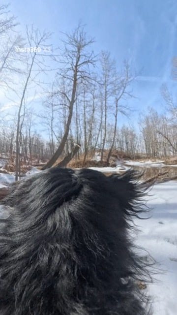 Aside from Kris, the Berners and Beaker LOVE the snow as it falls. It gives Bunsen a ton of energy, and the older guy has been frolicking as the drifts slowly melt along the creek walls on the farm.