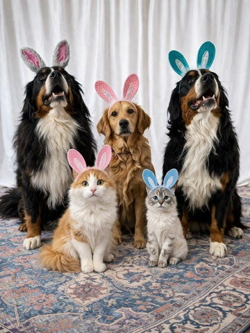 I love reading your newsletters! I feel like I’m a relative, perhaps a long-lost 2nd or fifth cousin. One question - how did you get 3 dogs and 2 cats to sit together and pose so beautifully?? Reminds me of photos that my mom took of her 4 (under 5 yr old) daughters, when at least one of us would be acting up! Yours were so well behaved by comparison!!